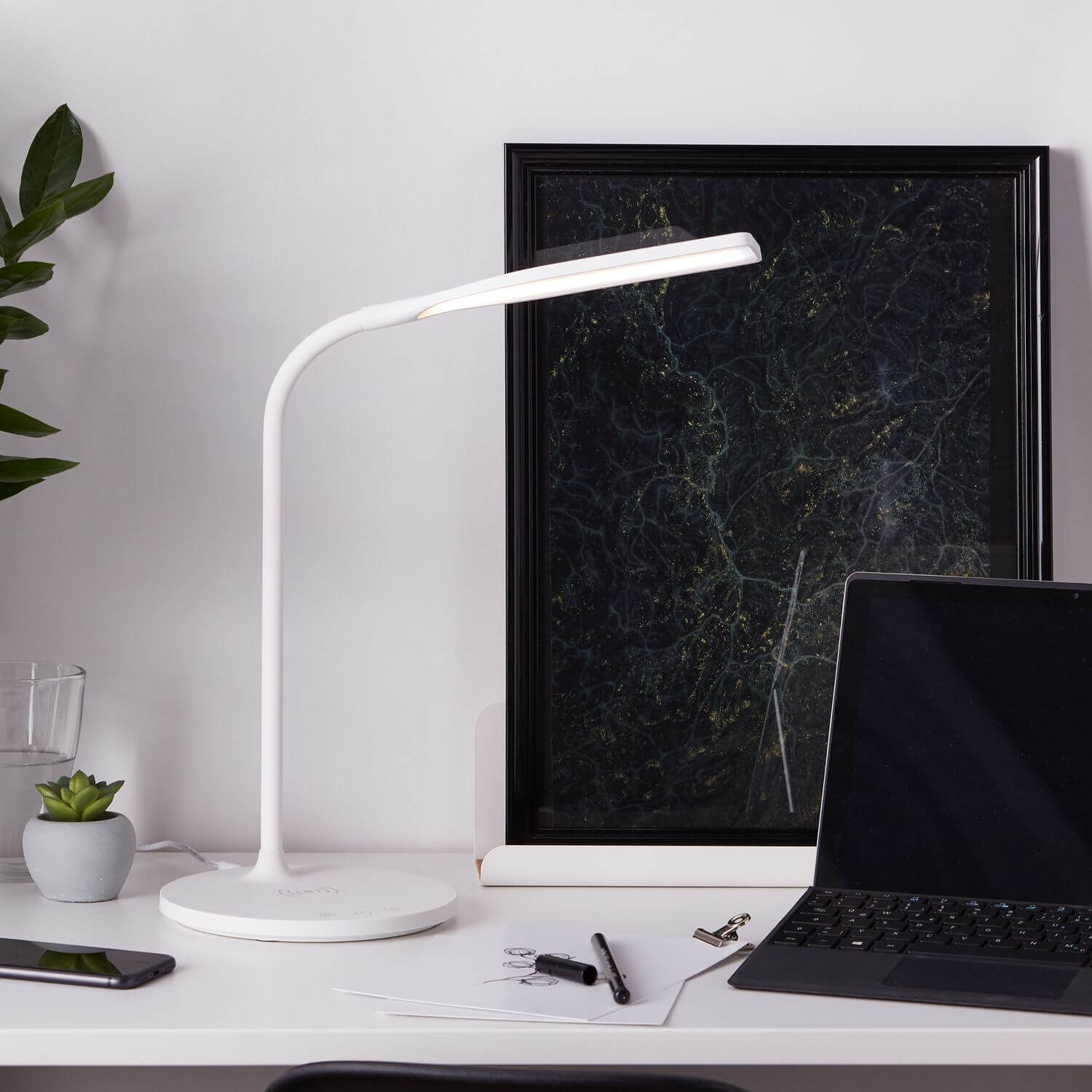 Die Tischleuchte Joni bereichert Wohn- und Arbeitszimmer und eignet sich sowohl zum Lesen und Schreiben als auch zur dekorativen Beleuchtung. Als ortsveränderliche Leuchte kann ihr Einsatzort problemlos verändert werden.Energiesparend und langlebig ist diese Leuchte durch die Verwendung von LED-Technik. Die Lichtfarbe der LEDs lässt sich mittels der CCT-Technologie von warmweiß bis kaltweiß individuell je nach gewünschtem Ambiente wählen. CCT definiert die Farbtemperatur einer weißen LED und wird in Kelvin angegeben. Diese Tischleuchte verfügt über eine integrierte induktive Ladefunktion. Lege einfach Dein Handy, Deine Kopfhörer oder andere Gadgets, die für kabelloses Laden geeignet sind, auf die Ladefläche. Diese 2-in-1-Funktion spart nicht nur Platz, da Du keine zusätzliche Ladestation benötigst, sondern ist gleichzeitig auch noch sehr praktisch. So hast Du immer alle Geräte voll aufgeladen und griffbereit - ohne dass ein Ladekabel notwendig ist.