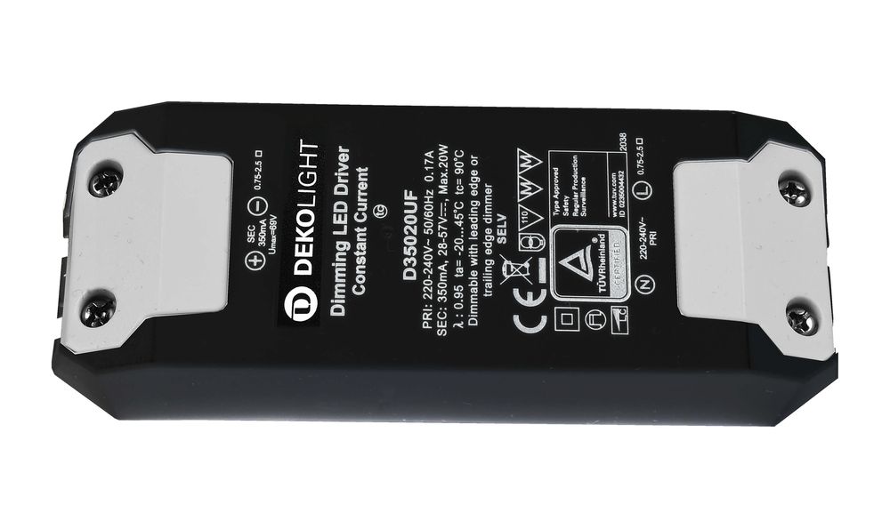 • Deko-Light LED-Netzgerät, BASIC, DIM, CC, D35020UF/20W, dimmbar: Phasenan-/abschnitt, Eingangsspannung: 220-240V AC/50-60Hz, Ausgangsspannung: 28-57V DC, Ausgangsstrom: 350 mA, 9,80-20,00 W