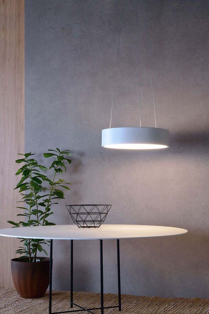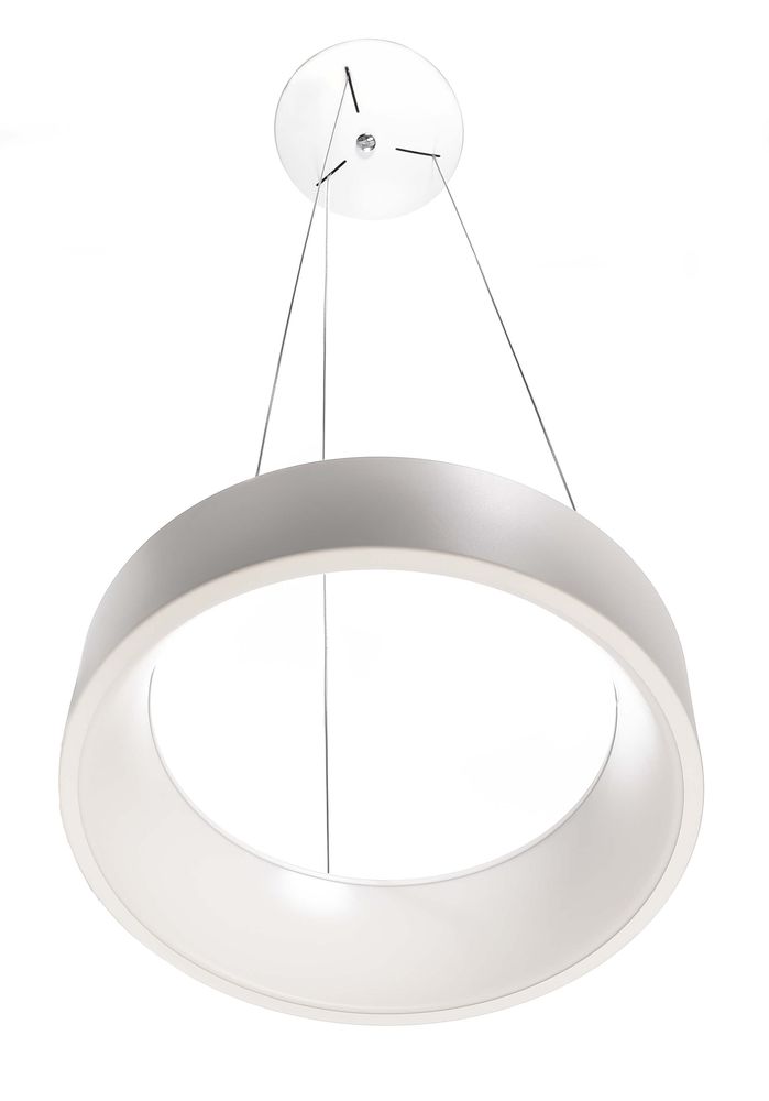 • Leuchtender Ring – Die LED Pendelleuchte in mattweißer Optik überzeugt mit einem breiten Abstrahlwinkel von 150° und einem warmweißen Wohlfühl-Licht. Die insgesamt 168 LEDs (50W, 3000K) sitzen in einem runden Schirm, der über drei dezente Drahtseile von der Decke abgehängt wird. Die flexible Dimmung erfolgt über Phasenanschnitt oder Phasenabschnitt.