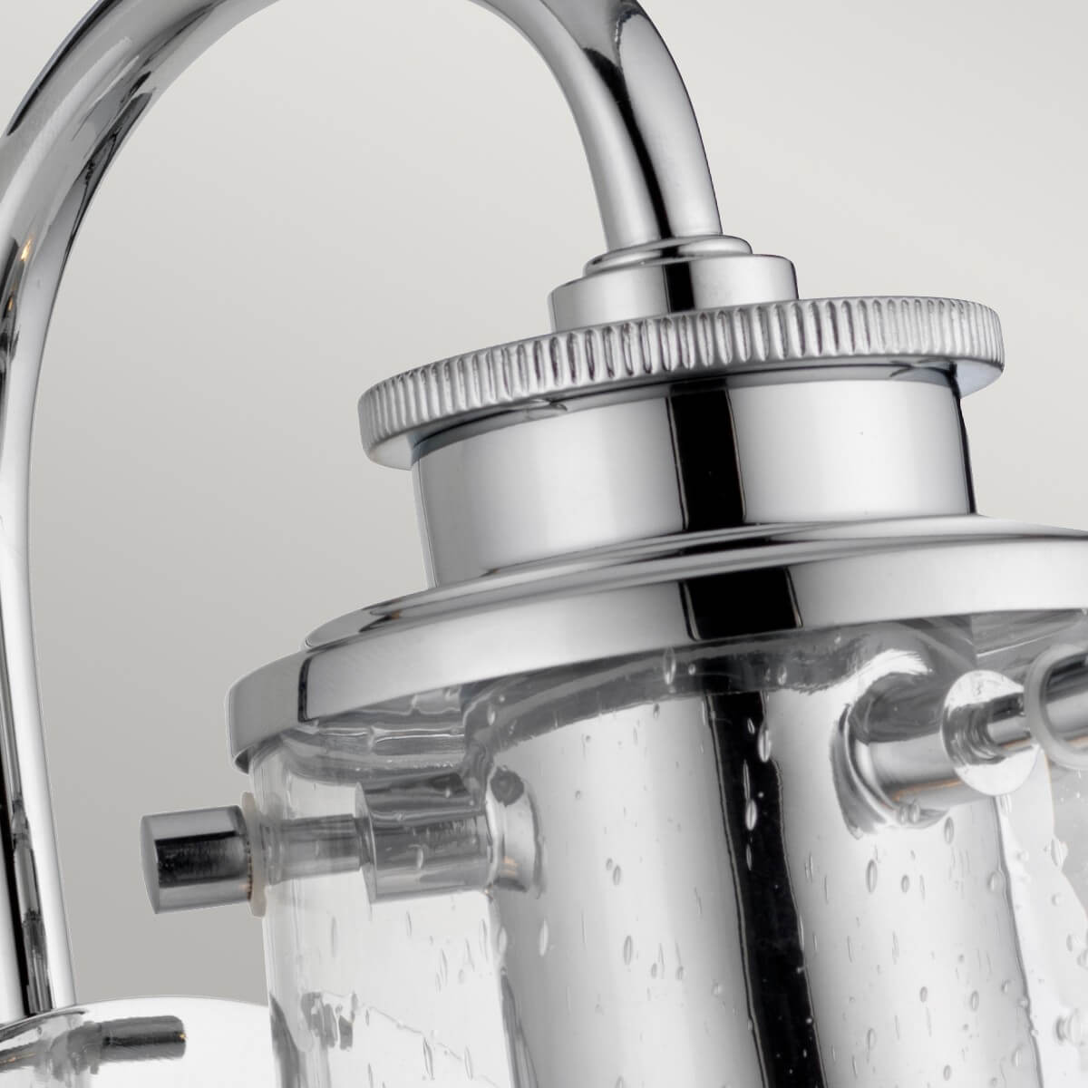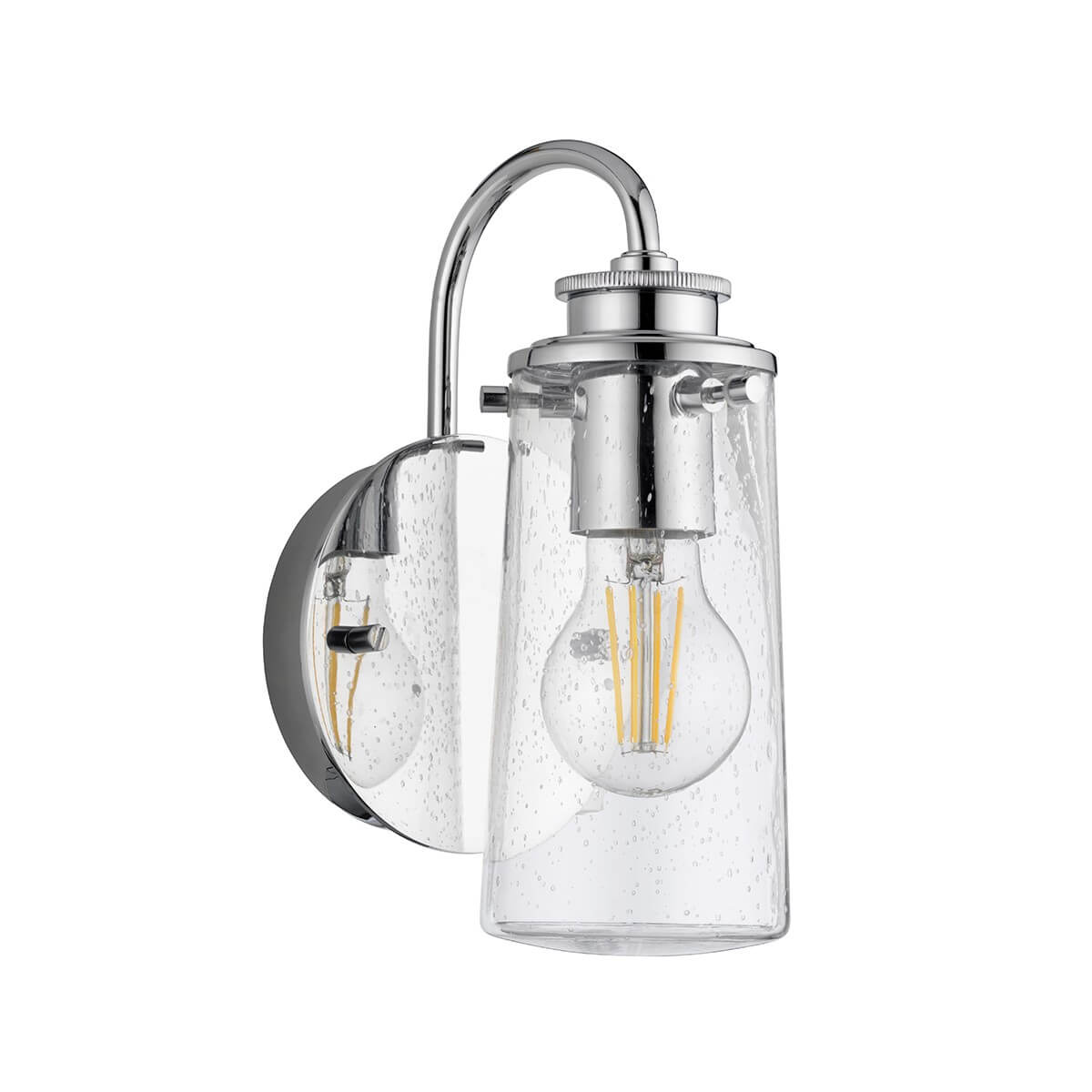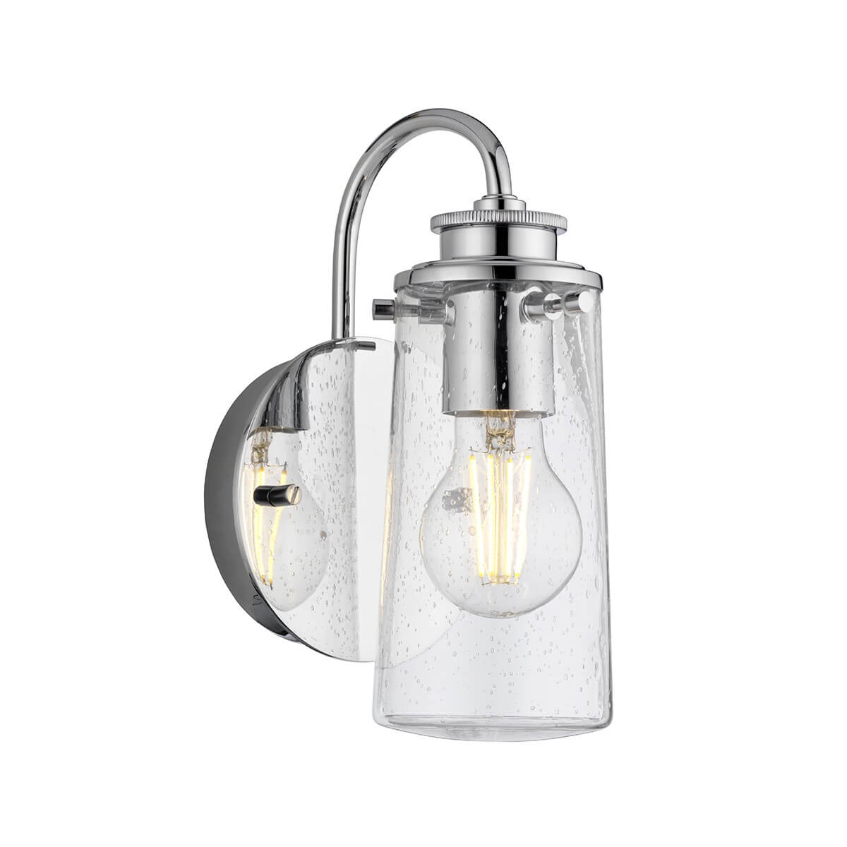 • Diese 1-Licht-Wandleuchte aus der Braelyn-Kollektion besticht durch ihren zurückhaltenden Stil. Das industrielle Design im Vintage-Stil wird durch die Schirme aus klarem Seedy-Glas unterstrichen, die an Glasgefäße erinnern, die im 19. Die polierte Chromoberfläche unterstreicht diesen Stil und macht die Leuchte zur perfekten Ergänzung für jeden Raum.