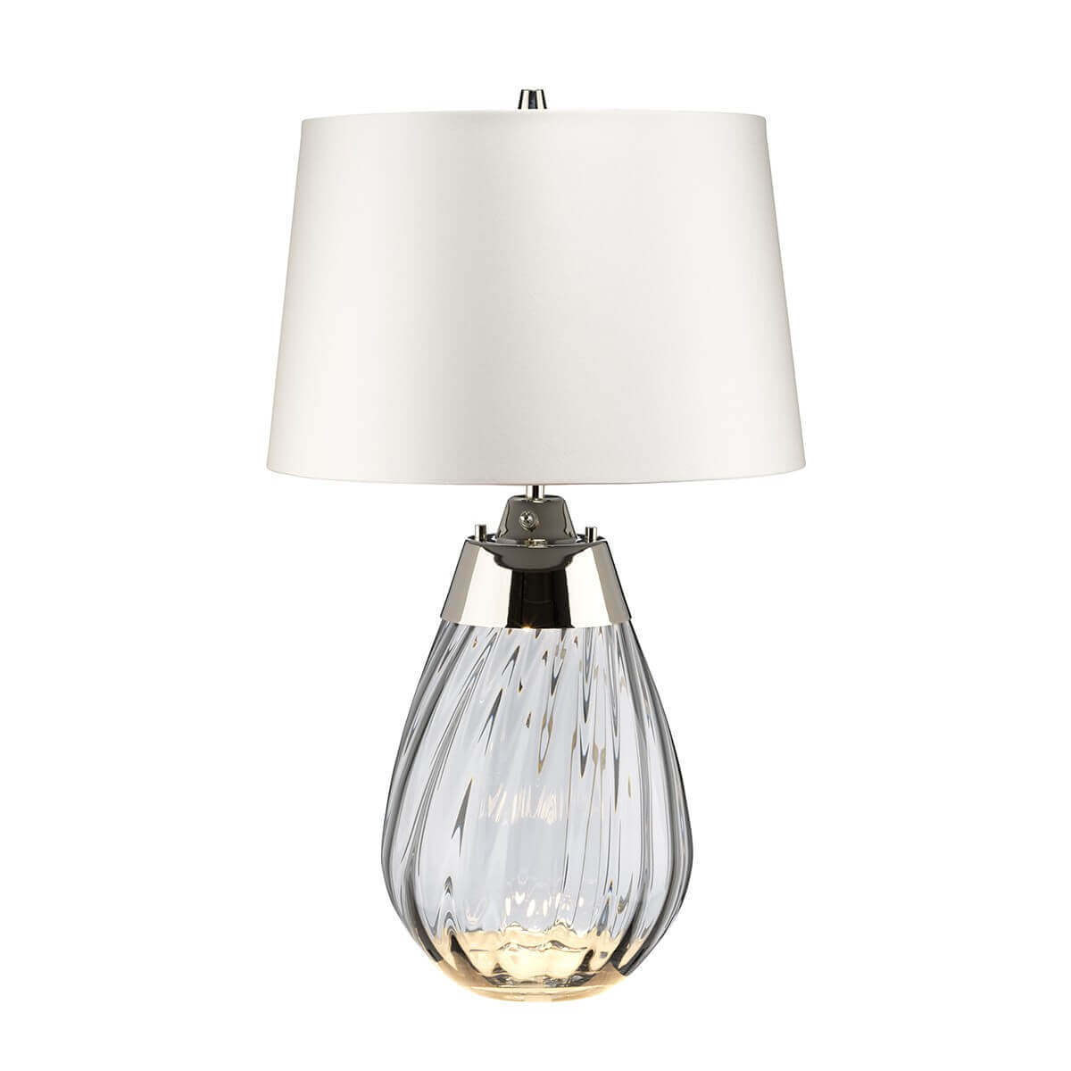 • Der elegante, fließende Schwung des mundgeblasenen Glases von Lena bildet zusammen mit dem Metallgestell aus poliertem Nickel ein eindrucksvolles Bild. Sie ist mit dem Dual-Lit-System von Elstead kombiniert, einem 4-Wege-Schalter, der sowohl den Schirm als auch den Sockel beleuchtet (GU10 im Sockel). Die Schirme werden in Großbritannien hergestellt und sind mit satiniertem, glattem Stoff und mattsilbernem Laminat ausgekleidet.