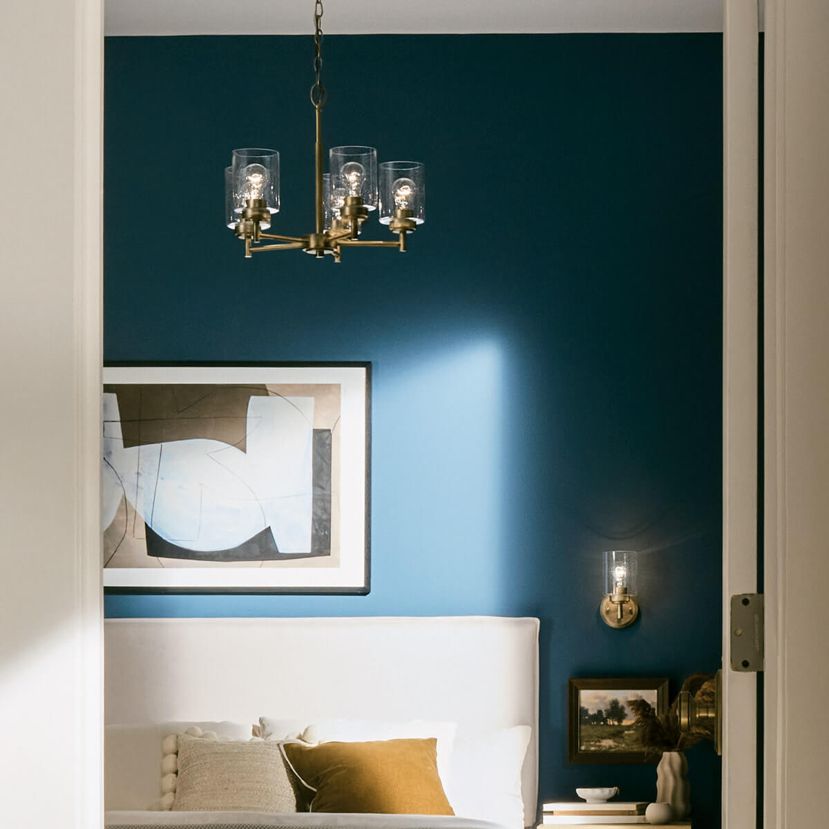 Elstead Winslow Kronleuchter E27 5-fach Naturmessing Glas mit Luftbläschen