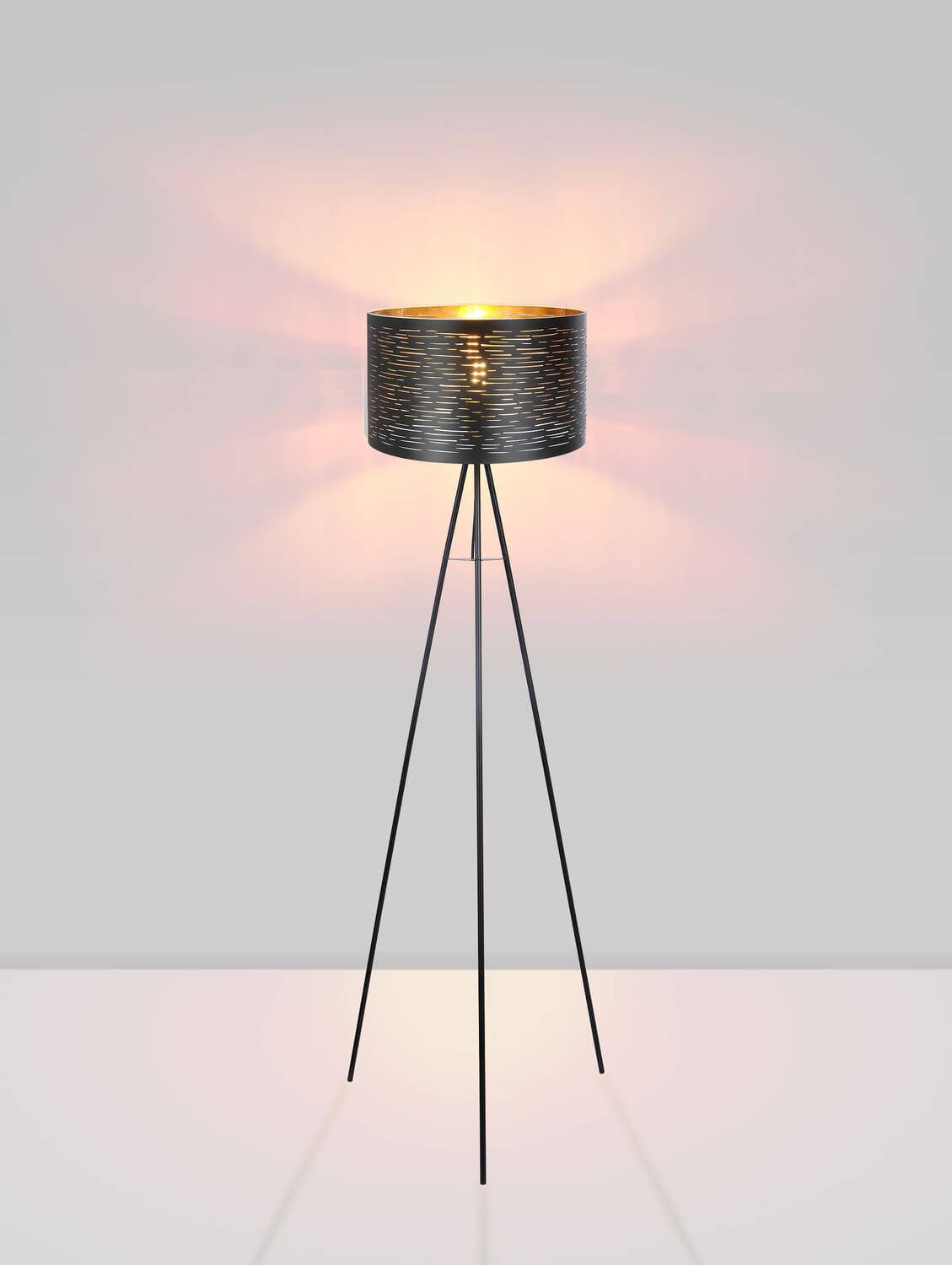 • Mit dieser dreibeinigen, äußerst modernen Stehlampe in Schwarz, aus der Serie TUNNO, werden leuchtende Akzente gesetzt. Eingesetzt z. B. im Wohnzimmer oder Büro, kann dieses Modell, mit seinen Dekorstanzungen, einen Durchmesser von 38 cm und der goldenen Farbe im Inneren, zu einer behaglichen Umgebung beitragen. Der serienmäßige Ein/Aus Schalter und das 1,8 Meter lange Anschlusskabel machen sie flexibel einsetzbar. Sie verfügt über eine E27 Fassung, welche Ihnen ermöglicht, Ihr Leuchtmittel frei zu wählen. Wir empfehlen Ihnen LED-Lampen, aufgrund ihrer Stromersparnis und Langlebigkeit.
