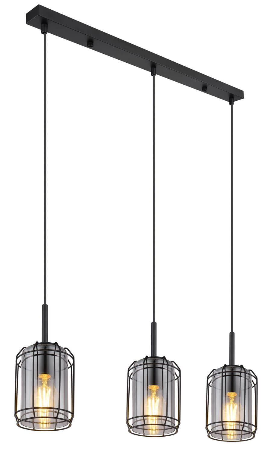 Hängeleuchte Metall schwarz matt, Glas rauchfarben, Metall schwarz matt, Höhe kürzbar, LxBxH: 770x130x1200mm, exkl. 3x E27 60W 230V