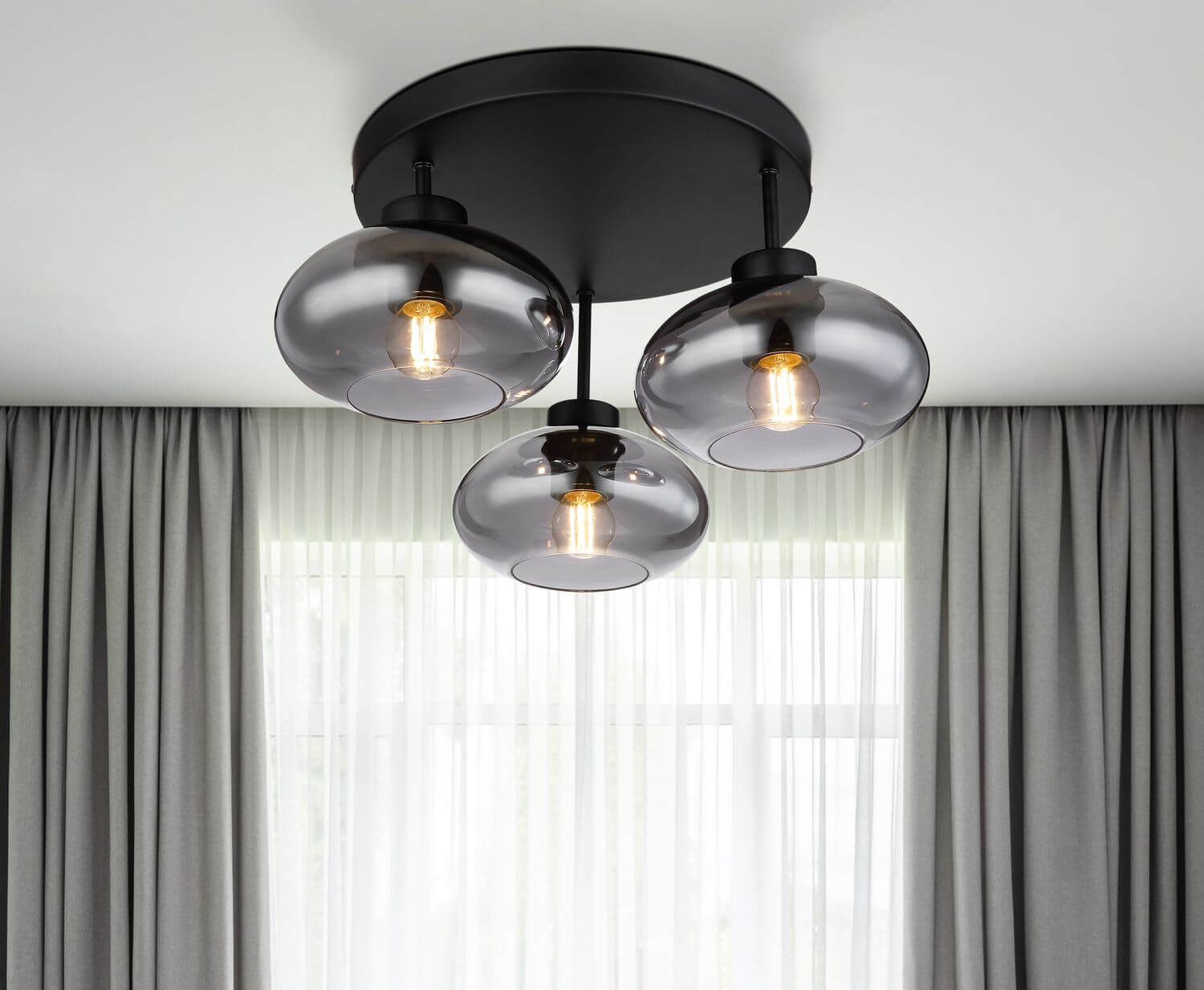 • Diese runde Deckenleuchte der Serie SHAUN überzeugt durch stilvolles Design. Aus einer runden Deckenbefestigung ragen drei schwarz matte Metallstangen und münden jeweils an einer E27 Fassung, welche von formschönen Glasschirmen in Rauchfarben bestückt sind. Die E27 Fassungen ermöglichen Ihnen die freie Auswahl, bis zu einer maximalen Leistung von 40 Watt, selbst über Lichtfarbe und Helligkeit zu bestimmen.