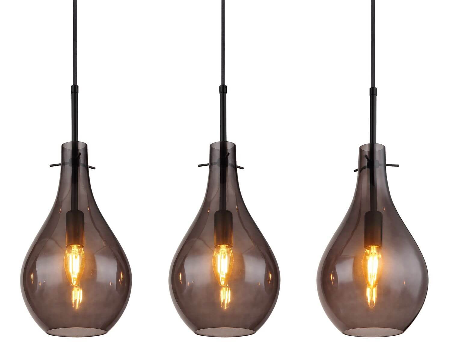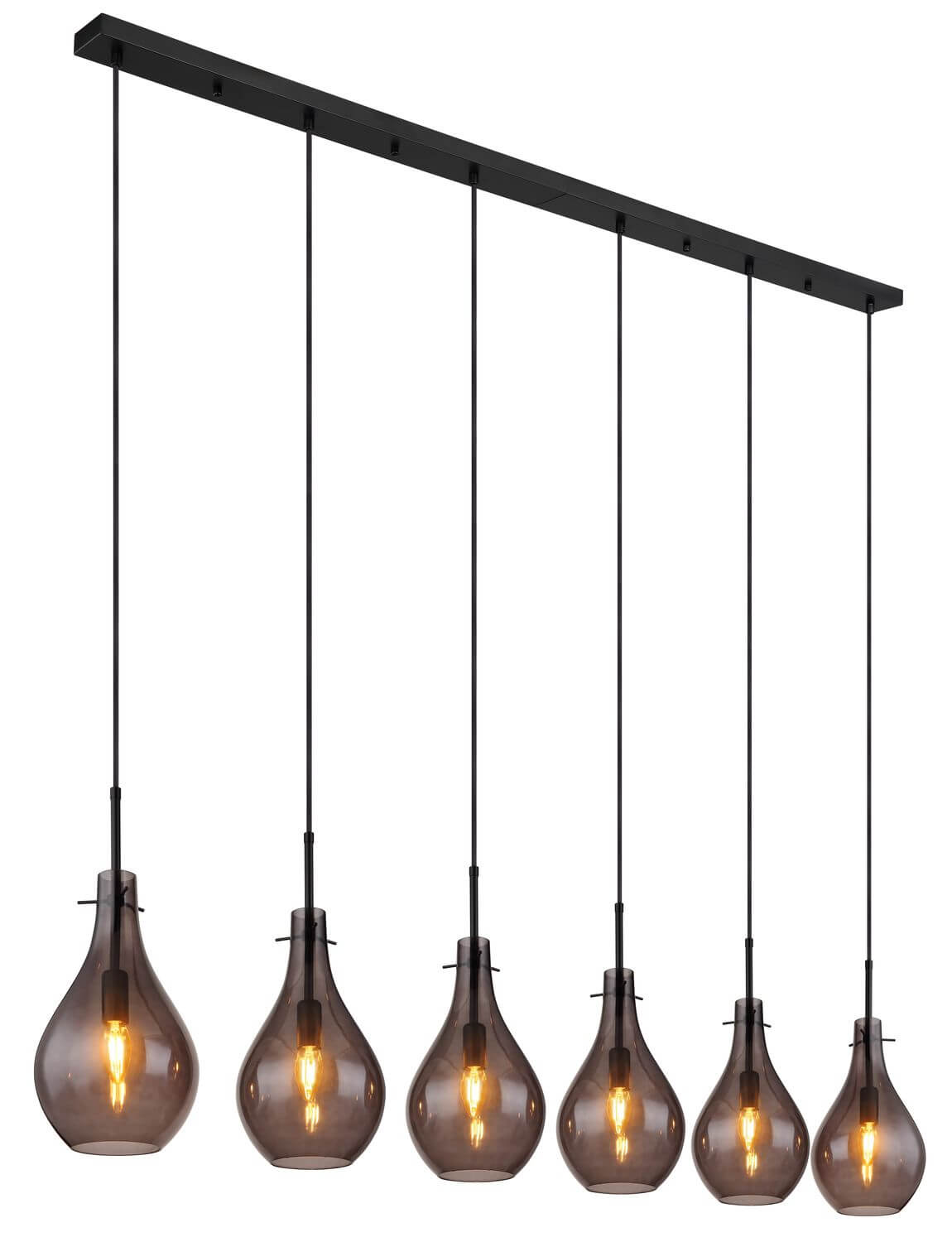 Hängeleuchte Metall schwarz matt, Glas rauchfarben, Kabel PVC Schwarz, Höhe kürzbar, Wandschild in der Mitte geteilt, LxBxH: 1400x180x1200mm, exkl. 6x E14 40W 230V