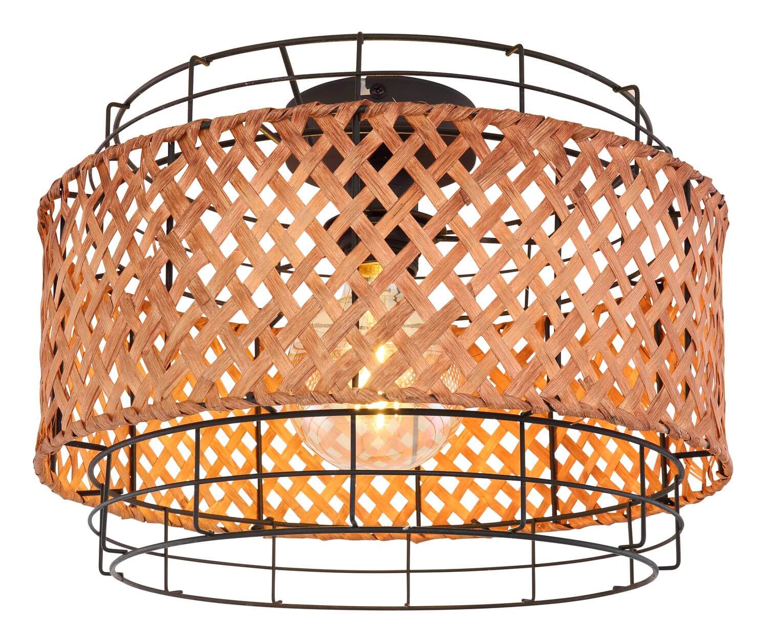 • Diese Vintage Deckenleuchte besticht durch ihr Industrial/Boho Design. Der schwarze Metallkorb und das Bambusgeflecht harmonieren perfekt miteinander und verleihen jedem Raum etwas Besonderes. Die Lampe ist mit einer E27 Fassung ausgestattet und wir empfehlen ein LED Filament Leuchtmittel (max. 40W), um den Vintage Stil abzurunden.