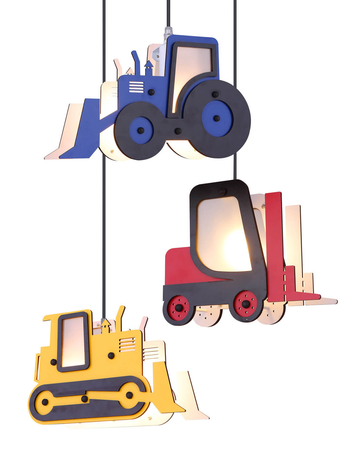Form & Design: rund, 3 Hänger, je 1 x Bagger, Stapler, Schubraupe