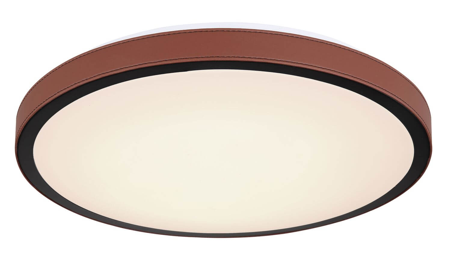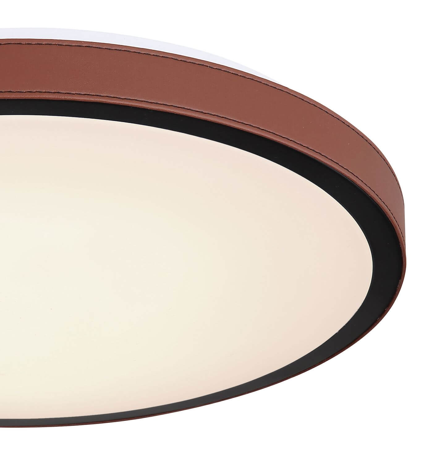 Deckenleuchte Metall weiß, Acryl opal, Aluminium schwarz matt, Kunstleder dunkelbraun, 3000-4500-6000K Schalter am Artikel, ø: 420mm, H: 95mm, inkl. LED 24W 230V, 2400lm Source, 1189lm Output, CCT 3000/4500/6000K