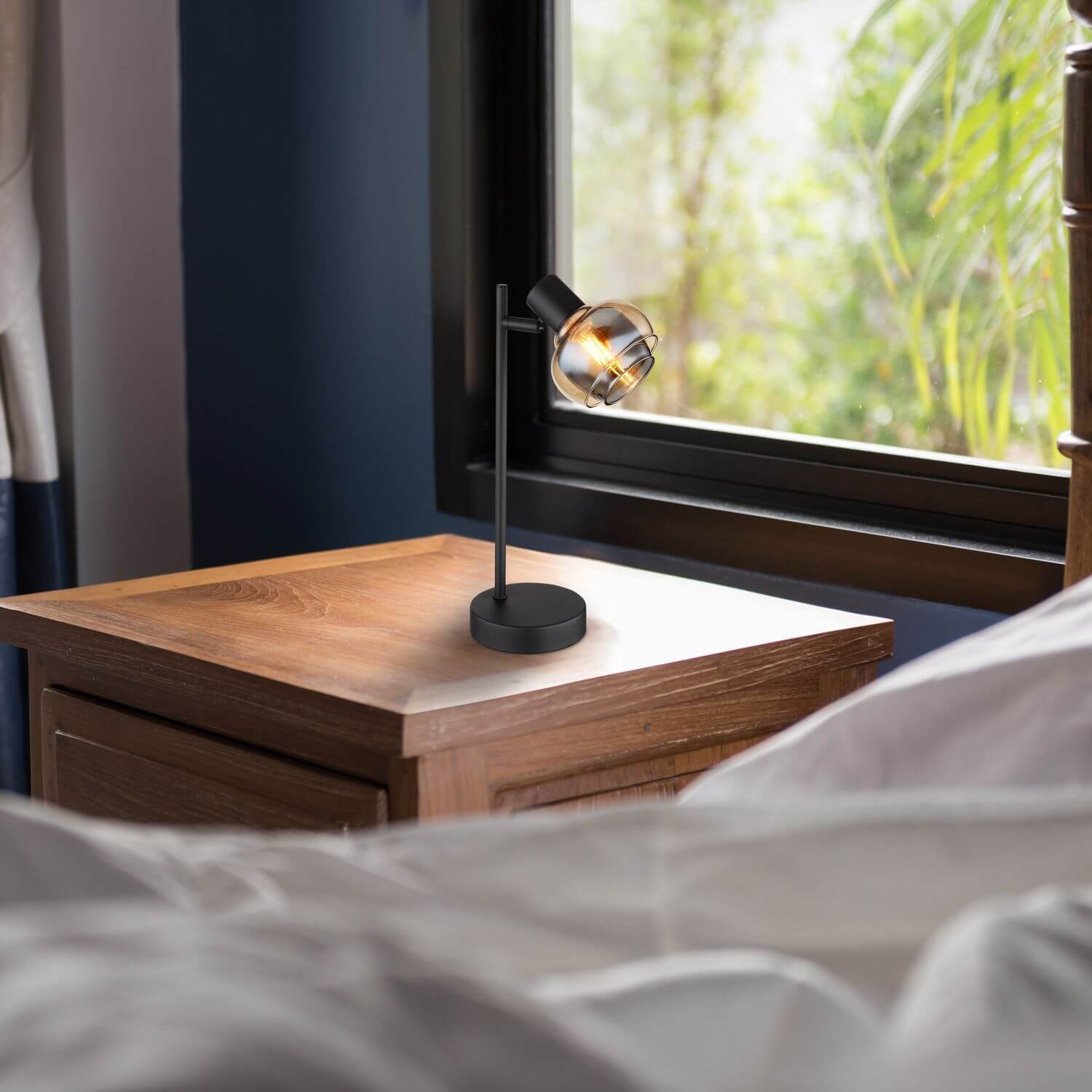 Tischleuchte Metall schwarz matt, Glas amber, Glas rauchfarben, Kabel PVC Schwarz, Wippschalter am Kabel, LxBxH: 145x120x350mm, Kabellänge 1500mm, exkl. 1x E14 40W 230V