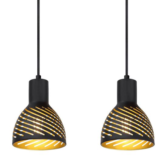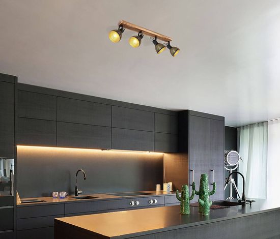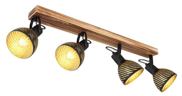 Strahler Holz dunkelbraun, Metall schwarz matt, goldfarben, Schirme mit Dekorschlitze, LxBxH: 800x125x250mm, exkl. 4x E27 40W 230V