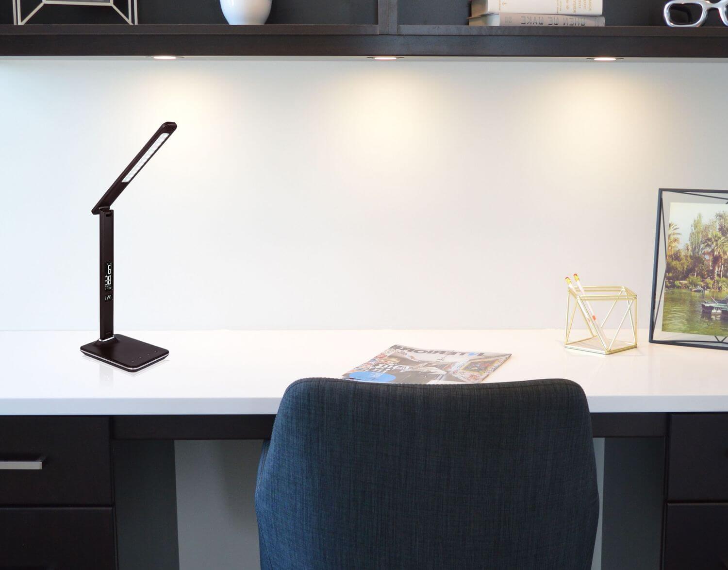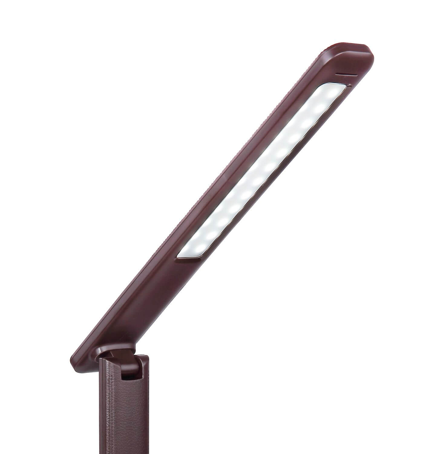 Tischleuchte Kunststoff dunkelbraun, verchromt, dimmbar, Touchdimmer, Farben fixierbar, Uhr, Alarm, Adapter inkl., Batterie inkludiert 1x CR2032, Lederoptik, LxBxH: 595x140x590mm, Kabellänge 1500mm, inkl. LED 7W 230V, 360lm Source, 278lm Output, CCT 3000/4500/6000K