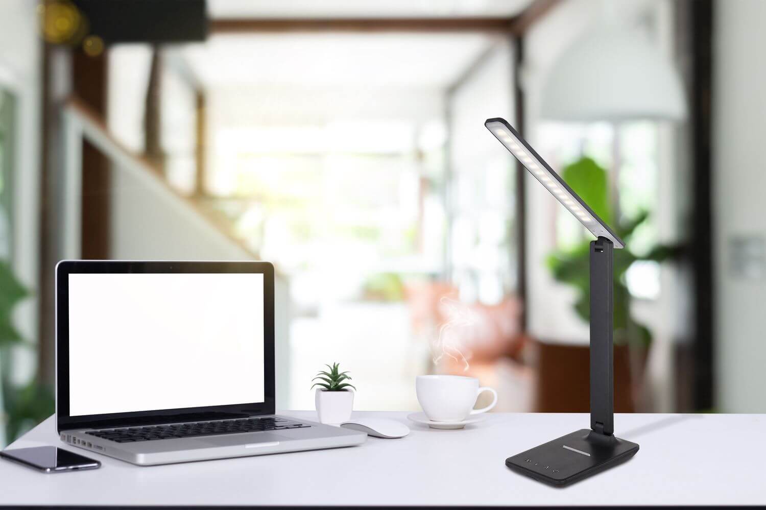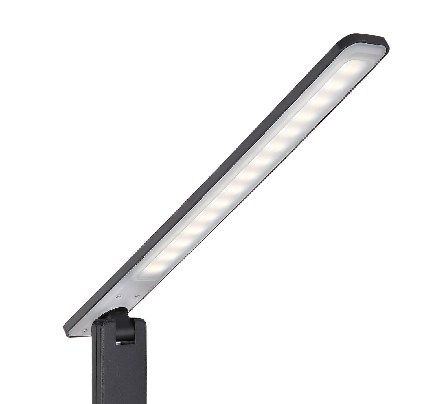 Tischleuchte Kunststoff schwarz, opal, Druckschalter, Touch Ein/Aus, dimmbar, Touchdimmer, Farben fixierbar, Adapter inkl., USB Kabel inkl., Lederoptik, LxBxH: 420x115x565mm, Kabellänge 1200mm, inkl. LED 6W 230V, 40-550lm Source, 20-350lm Output, CCT 3000/4500/6000K