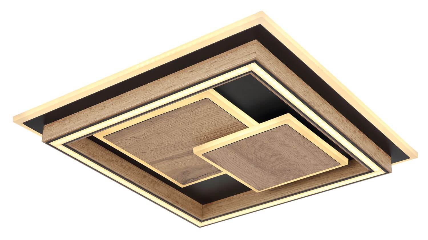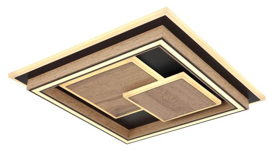 Deckenleuchte Metall schwarz matt, MDF holzoptik dunkel, Acryl opal, mehrere Stufen über Wandschalter, Memoryfunktion, 3 Stufen: 1 - innere LEDs, 2 - äußere LEDs, 3 - alle zusammen, LxBxH: 410x410x76mm, inkl. LED 32W 230V, 3900lm Source, 1600lm Output, 3000K