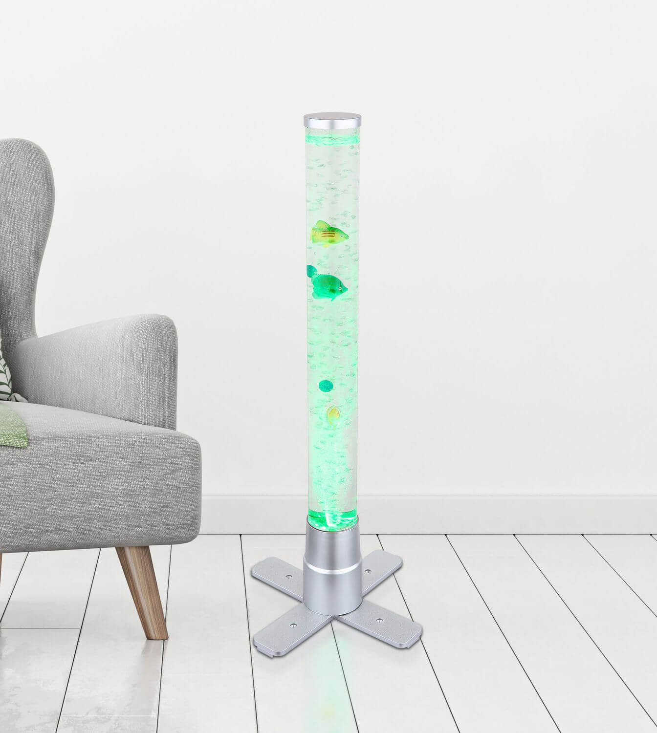Stehleuchte Kunststoff silberfarben, Kunststoff klar, Kabel PVC Schwarz, Wippschalter am Kabel, RGB Farbwechsler, inkl. 3 Fische und 2 Kugeln, 1,2lt. Wasserinhalt, LxBxH: 246x246x611mm, Kabellänge 1800mm, inkl. RGB LED 0.06W 230V, 4lm Output