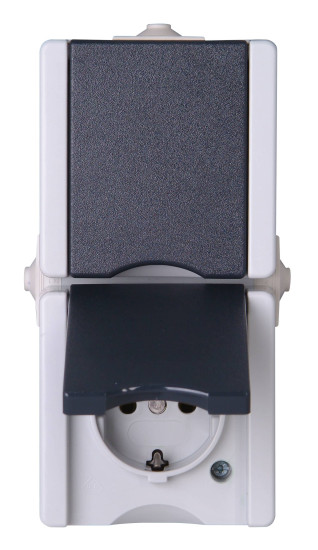 Aufputz-Feuchtraum, Schutzkontakt-Steckdose mit Klappdeckel, 2-fach, senkrecht, mit Berührungsschutz, 16A, 250V~, proAQA, hellgrau/dunkelgrau EAN: 4008224586481