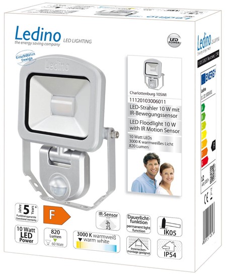 • Ledino LED-Strahler mit Sensor PIR Fluter Charlottenburg 10SWI,10W, 3000K, silber warmweiss