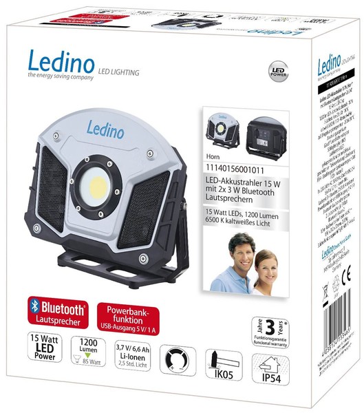 • Ledino Musik LED-Akkustrahler 15W Fluter Horn, mit Boxen, Bluetooth tageslichtweiss