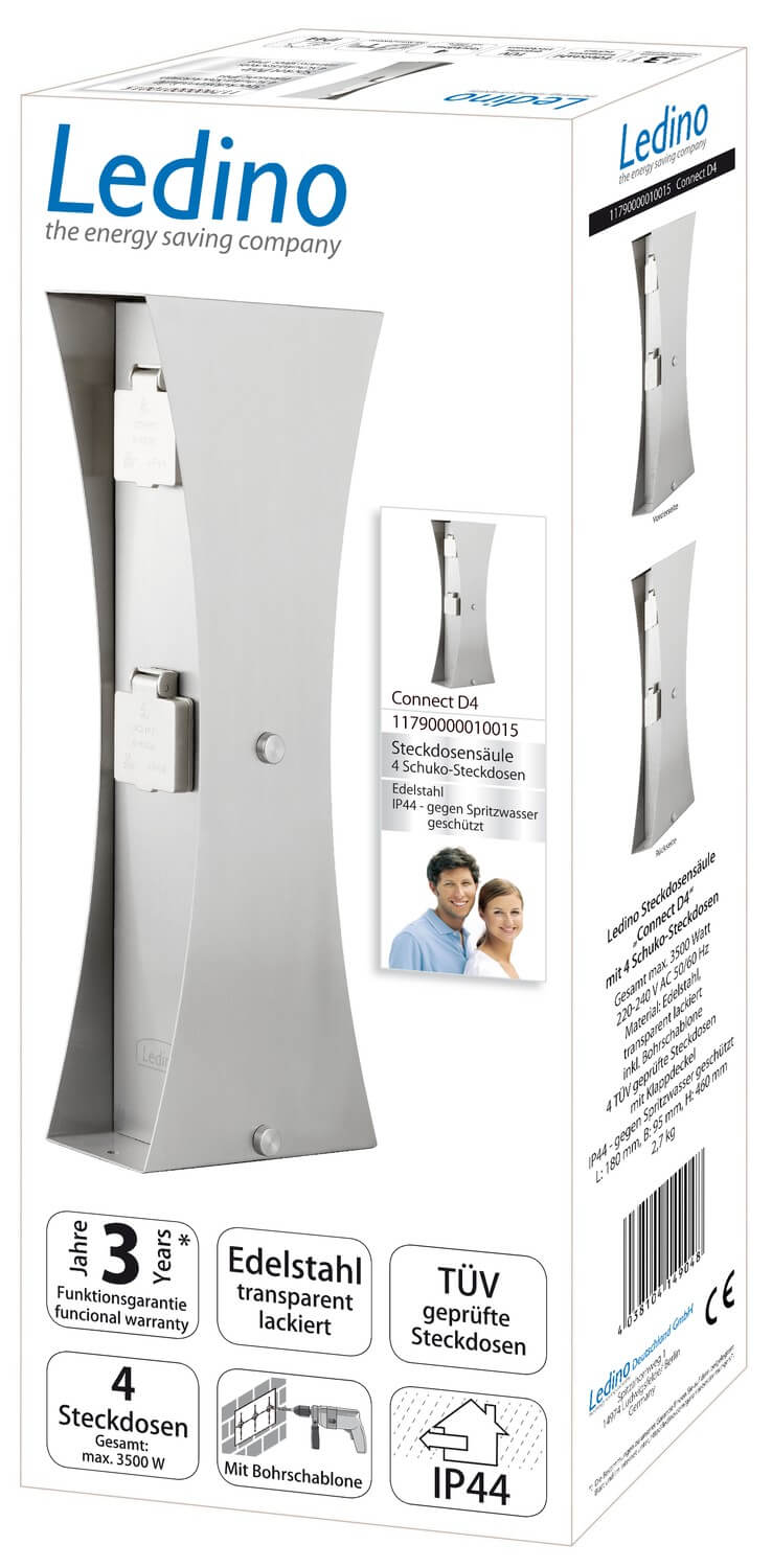 Ledino Steckdosensäule 4er Connect D4, Edelstahl Außen Design-Stromsäule