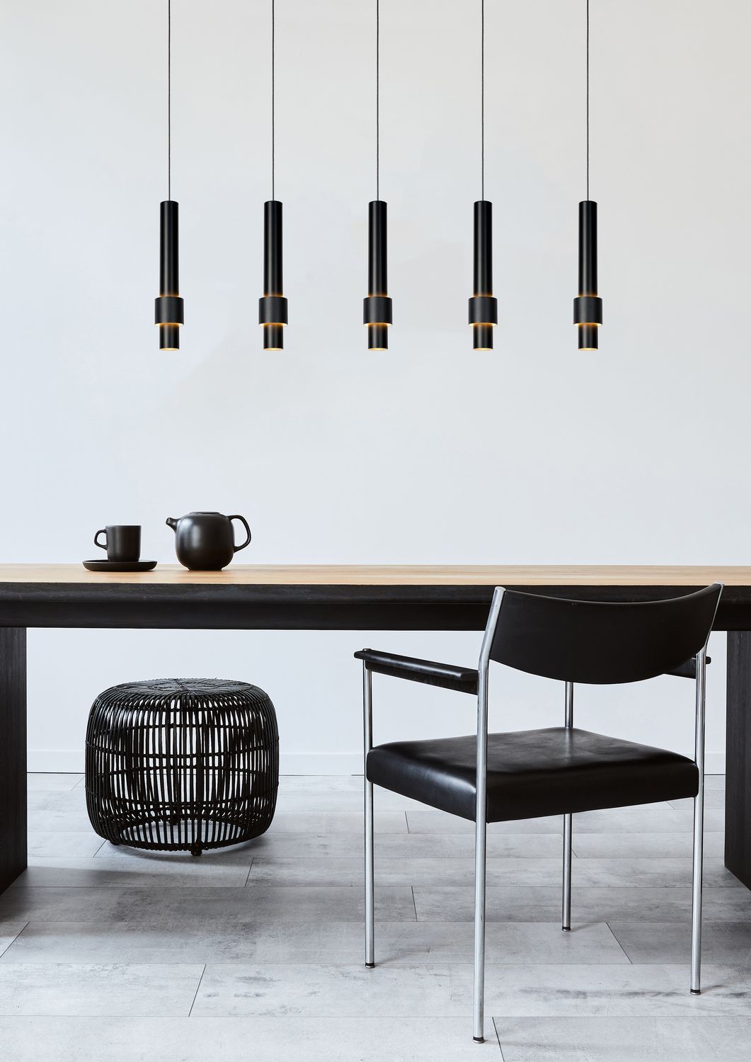 • Warum sollte man sich auf 4 Lichtpunkte beschränken, wenn man auch 5 haben kann? Diese Hängeleuchte namens Margary bringt einen luxuriösen Blickfang in Ihr Interieur. Sie passt perfekt über den Esstisch eines zeitgenössischen Interieurs, die raffinierte Auswahl an Materialien und Farben passt jedoch ebenso gut in einen eher rustikalen Stil. Die Befestigungsplatte aus Aluminium bildet die Grundlage für die 5 schlanken Pendel. An jedem von ihnen hängt ein leicht konischer Aluminiumzylinder, in dem der jeweilige Lichtpunkt enthalten ist. Dies ist eigentlich in der Mehrzahl gemeint. Denn zusätzlich zu einem Downlighter ganz unten im Zylinder faltet sich eine zweite integrierte LED-Lampe um die elegante Röhre. Sie ist wiederum von einem zweiten Zylinder umgeben. Das raffinierte Design dieser Formen und ihre Proportionen erzeugen einen geheimnisvolle Lichtglut. Das Ergebnis ist ein sofortiger Blickfang mit sternenförmigem Aussehen.