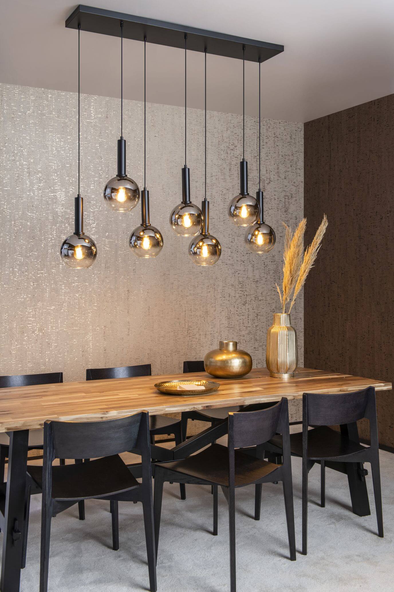 • Die kugelförmigen Glaslampenschirme von Marius bieten Ihnen und Ihren Tischnachbarn stilvolle Gesellschaft. Diese moderne Pendelleuchte kombiniert hochwertige Materialien wie elegantes Fumé-Glas und Metall zu einem Blickfang von Format. Und das können Sie durchaus wörtlich nehmen. Immerhin beträgt die Länge dieses Leuchters 130 Zentimeter und die Höhe kann von 70 bis 150 Zentimeter verstellt werden. Verbinden Sie die 7 Lichtquellen von Marius mit einem Dimmer und sorgen Sie dafür, dass Sie sich zu jeder Tageszeit wie zu Hause fühlen.