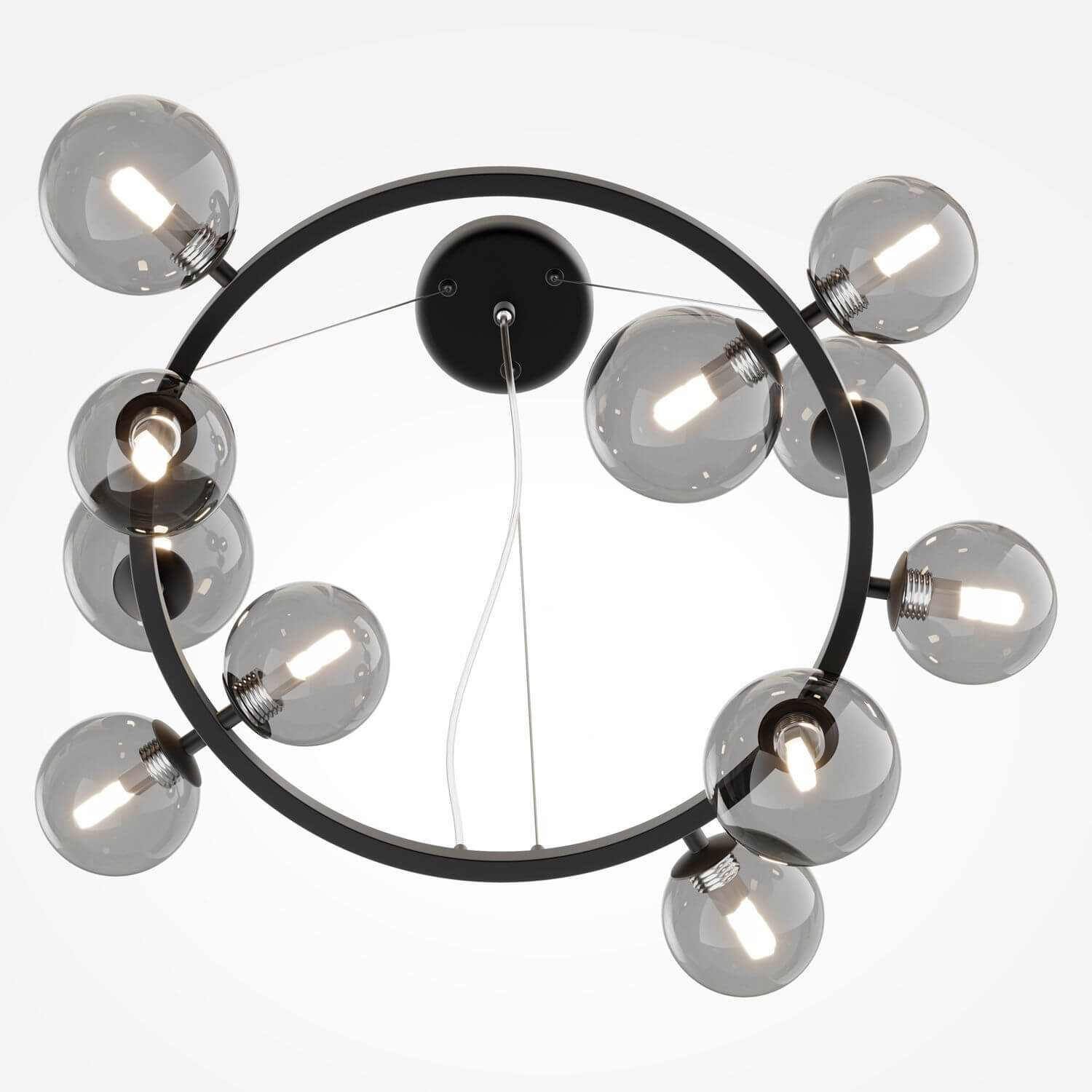 • Metallbeschläge in 4 Farbtönen: Mattes Schwarz, Schwarz, Chrom, Gold. Lampenschirme: Geblasenes Glas. Farbtöne: Rauch, Bernstein, Cognac, Mattes Weiß und Schwarz. Design mit Nachahmung der Molekularstruktur. Durch Seile einstellbare Höhe der Pendelleuchten. Leuchtmittel mit einer Fassung G9.