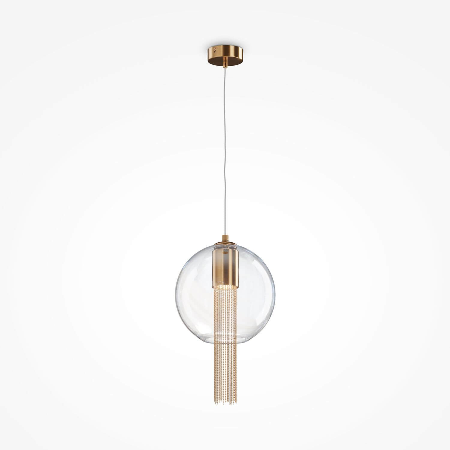 • Beschläge aus Metall in einem bronzefarbenen Farbton. Kugelförmiger Lampenschirm: transparentes geblasenes Glas. Dekor: Anhängerketten im Inneren des Lampenschirms. Versteckte Lichtquelle.