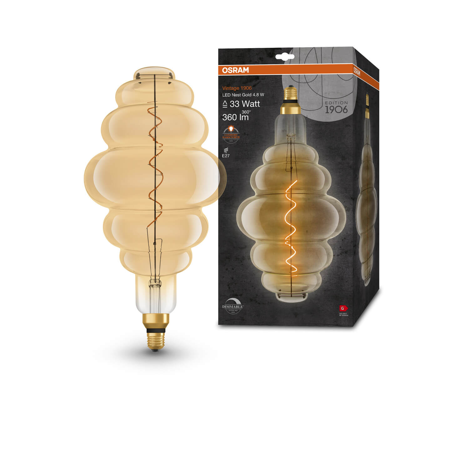 • OSRAM Vintage 1906 LED-Lampe mit Gold-Tönung, 4,8W, 360lm, Bienenstock-Form mit 200mm Durchmesser & E27-Sockel, warmweiße Lichtfarbe, dimmbares Filament, bis zu 15.000 Stunden Lebensdauer