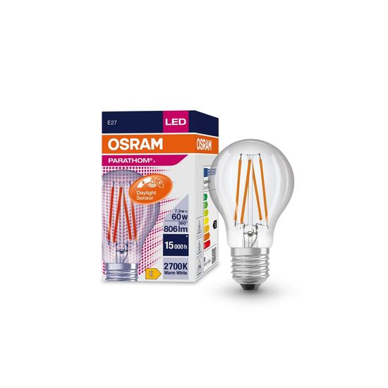 OSRAM PARATHOM Tageslichtsensor CLASSIC A 7.3W 827 klar E27 Lampe 806lm 2700K warmweiss wie 60W 4058075762015