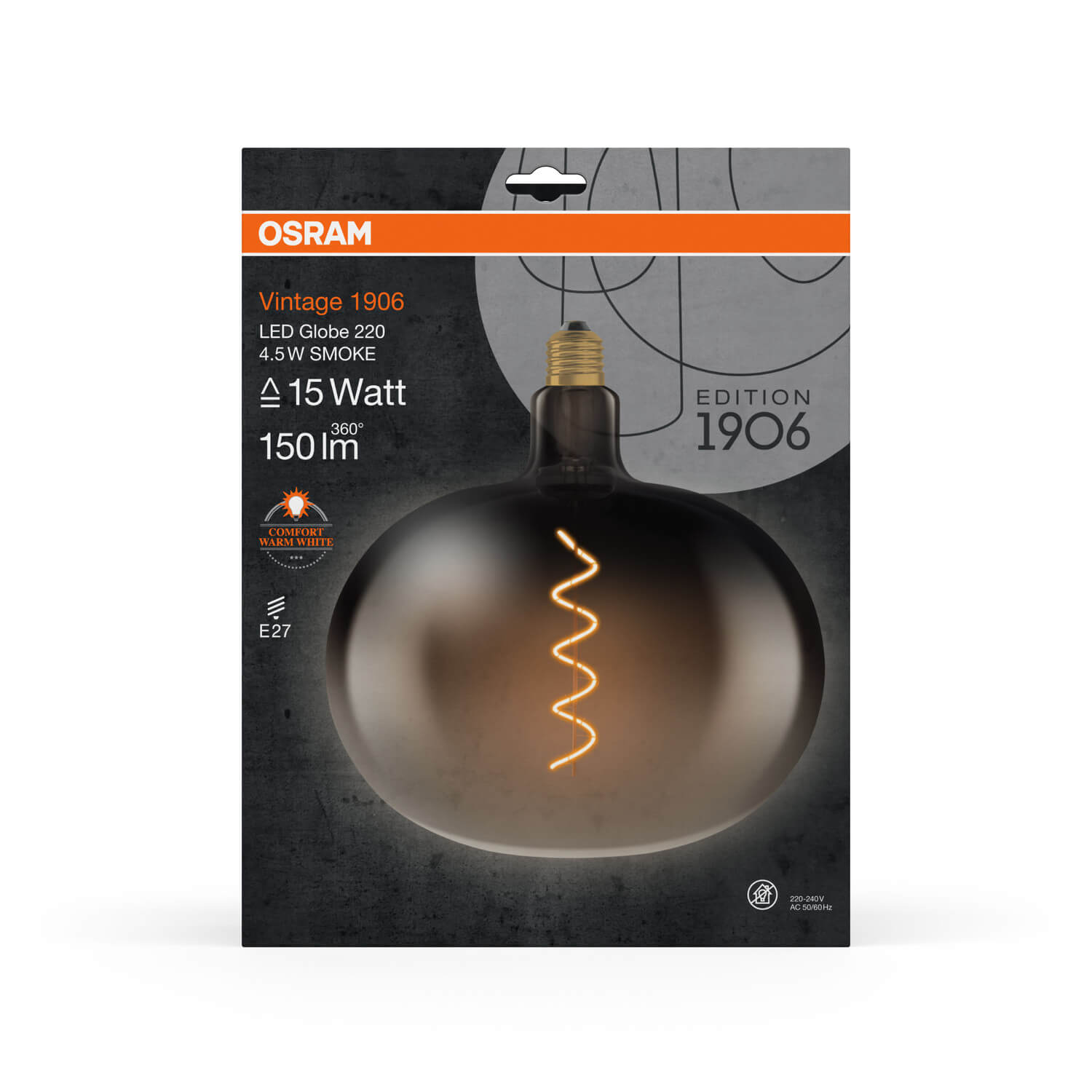 • OSRAM Vintage 1906 Big Globe, warmweiße LED-Lampe mit Filament in klassischer Ballform, bietet 4.5 W für 150 lm, E27 Fassung, Smoke Design, 220 mm Durchmesser, CRI 80, 1800 K.