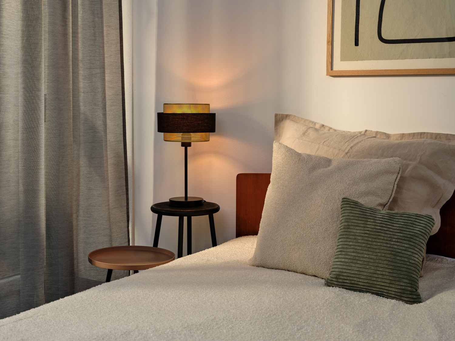 Deckenanbau-Leuchten aus goldenem Metall und Textil mit E14 Fassung. Produkteigenschaften: Gehäusematerial: Metall und Textil. Textilkabel. Produktvorteile: Design erfreut das Zuhause mit einer warmen Atmosphäre. Verschiedene Arten von Leuchten mit der gleichen Designsprache sorgen für einen einheitlichen Stil im Zuhause. Flexible Lampen-Wahl. Nachhaltig aufgrund des austauschbaren Leuchtmittels. Einfache Montage. Anwendungsgebiete: Innenraumanwendungen. Korridore, Eingangsbereiche, Treppenhäuser, Wohnzimmer, Keller. Schlafzimmer. Sicherheitshinweise: Alle elektrischen Anschlüsse dürfen nur von qualifiziertem Fachpersonal ausgeführt werden.. Vorsicht, Gefahr des elektrischen Schlages.. Produkt der Schutzklasse I. Alle elektrisch leitfähigen, metallischen Gehäuseteile, die im Betrieb oder während der Wartung im Fehlerfall Spannung aufnehmen können, müssen durchgängig mit dem Schutzleiter verbunden sein.. Prüfen Sie die Wand/Decke auf ihre Eignung. Wenn Sie unsicher sind, holen Sie professionellen Rat ein..