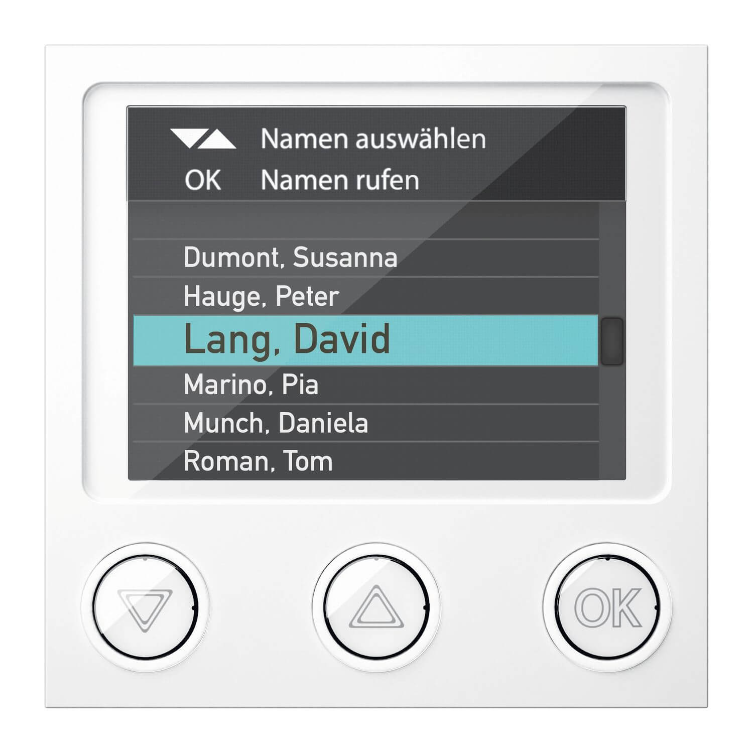• Für modulare Türstationen und Briefkastensysteme. Ersetzt eine große Anzahl von Klingeltasten. Ideal für große Wohnobjekte und Gebäudekomplexe. Verwaltung von bis zu 500 Namen / Teilnehmer -Auslösen des Klingelsignals über die Namensauswahl im Display. Auswahl der Namen über Namensliste oder Anfangsbuchstaben. 3 beleuchtete Bedientasten. TFT Farbdisplay mit einer Auflösung von 320x240 Pixel -Selbst bei direkter Sonneneinstrahlung gut lesbar. 2 Schriftgrößen wählbar. Verschiedene Hintergrundfarben wählbar. Animierte Icons zur optimierten Benutzerführung. Anzeige von Namen und Zusatztexten (z.B. Wegbeschreibung). Empfohlene Mindesteinbauhöhe 1,40 m. Komfortable Programmierung wahlweise über die PC Software Station Manageroder direkt über die Tastatur am Displaymodul. Die PC Software Station Managerkann wahlweise mittels USB Kabel direkt am Displaymodul oder über den Programmieradapter RGE1879000 in der Unterverteilung ausgeführt werden (Software-CD und USB-Kabel im Lieferumfang). Für nachträgliche Änderungen und Ergänzungen ist die Verwendung des Programmieradapters RGE1879000 sehr empfehlenswert. USB Anschluss. Kombination mit Codiermodul Portier 18764xx oder Acero 1519222 möglich. Im TwinBus Betrieb -Keine separate Spannungsversorgung erforderlich. Im RITTO IP Betrieb -Spannungsversorgung über 1647701. Einbauabmessungen 95x95x33 mm (BxHxT). Temperaturbereich -20 GradC bis +40 GradC. Hinweis Mit dem Acero Adapter Rahmen Portier RGE1816900 kann das Modul in Acero-Türstationen oder Briefkastenanlagen integriert werden. Lieferumfang Busverbinder, CD PC-Software Station Manager, USB-Kabel, Entriegelungskarte. Farbe weiß.