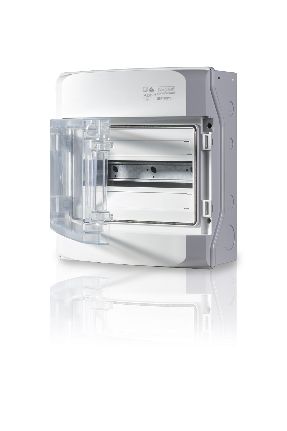 • 1-Reihiger Verteiler F-Tronic mit mit 12 Module und IP65 Schutzart für Geräte bis 63A.